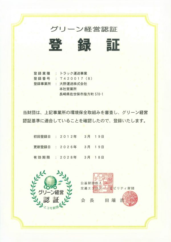 大野運送株式会社では安全性優良事業所としてGマーク認証を受けております。
